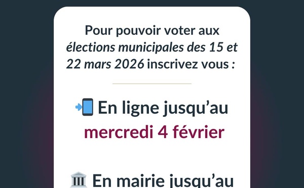 Rappel :  La date limite pour s’inscrire sur les listes électorales en mairie est fixée au vendredi 6 février 2026. Les inscriptions en ligne ne sont plus prises en compte depuis le 4...