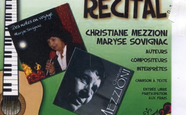 Christiane MEZZIONI et Maryse SOVIGNAC vous invitent à un récital à la salle de l'Enclos le vendredi 25 avril à 21 heures. Entrée libre