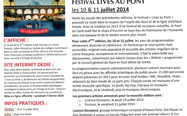 Vous trouverez en pièce jointe, préparé par la Direction de la Communication du Pont du Gard, le communiqué de presse sur le Festival du Pont du Gard : "Lives au Pont". Du 10 au 11 Juillet 2014,...