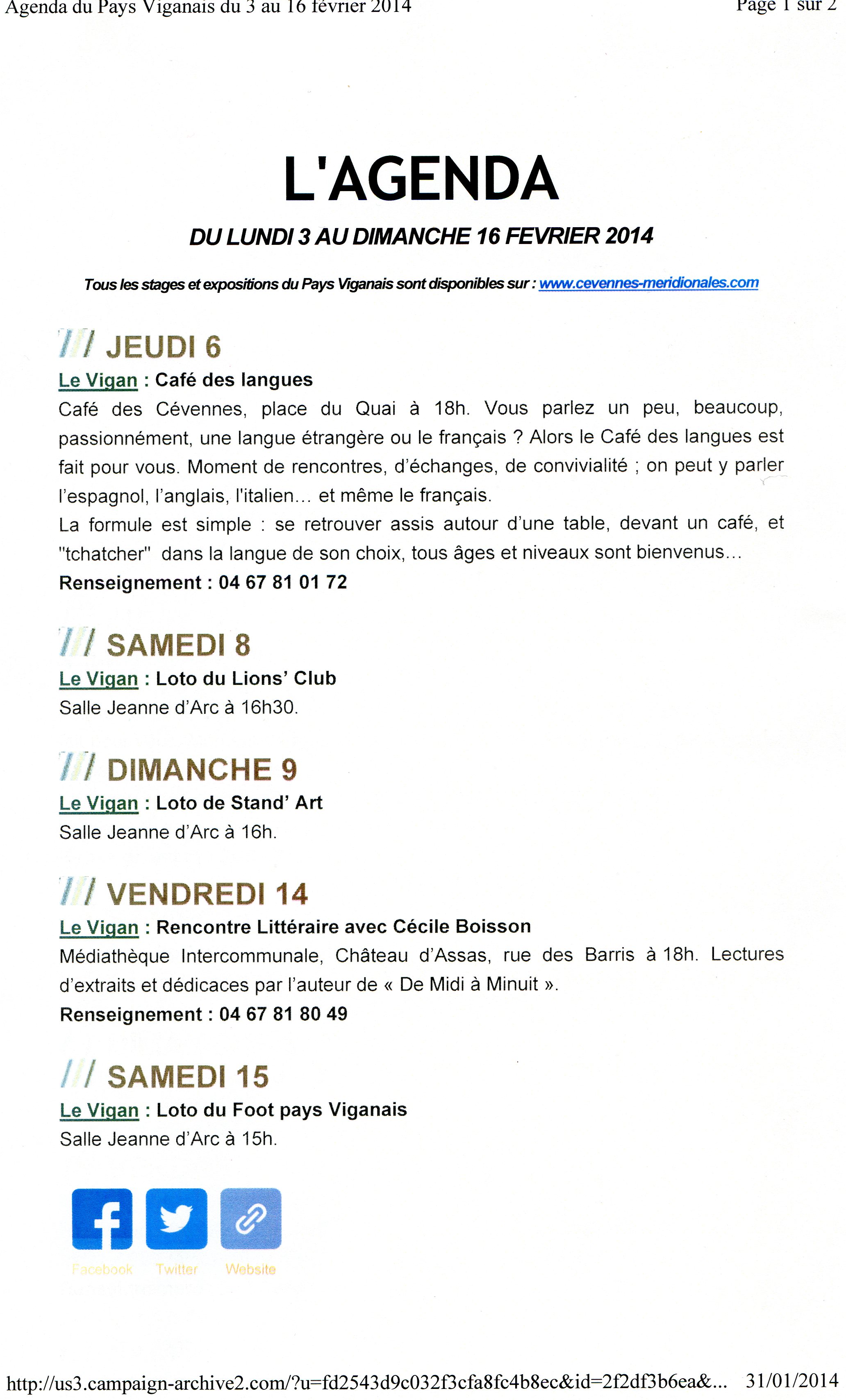 Voici comme chaque fin de semaine l'agenda du Pays Viganais du Lundi 3 au dimanche 16 Février 2014.