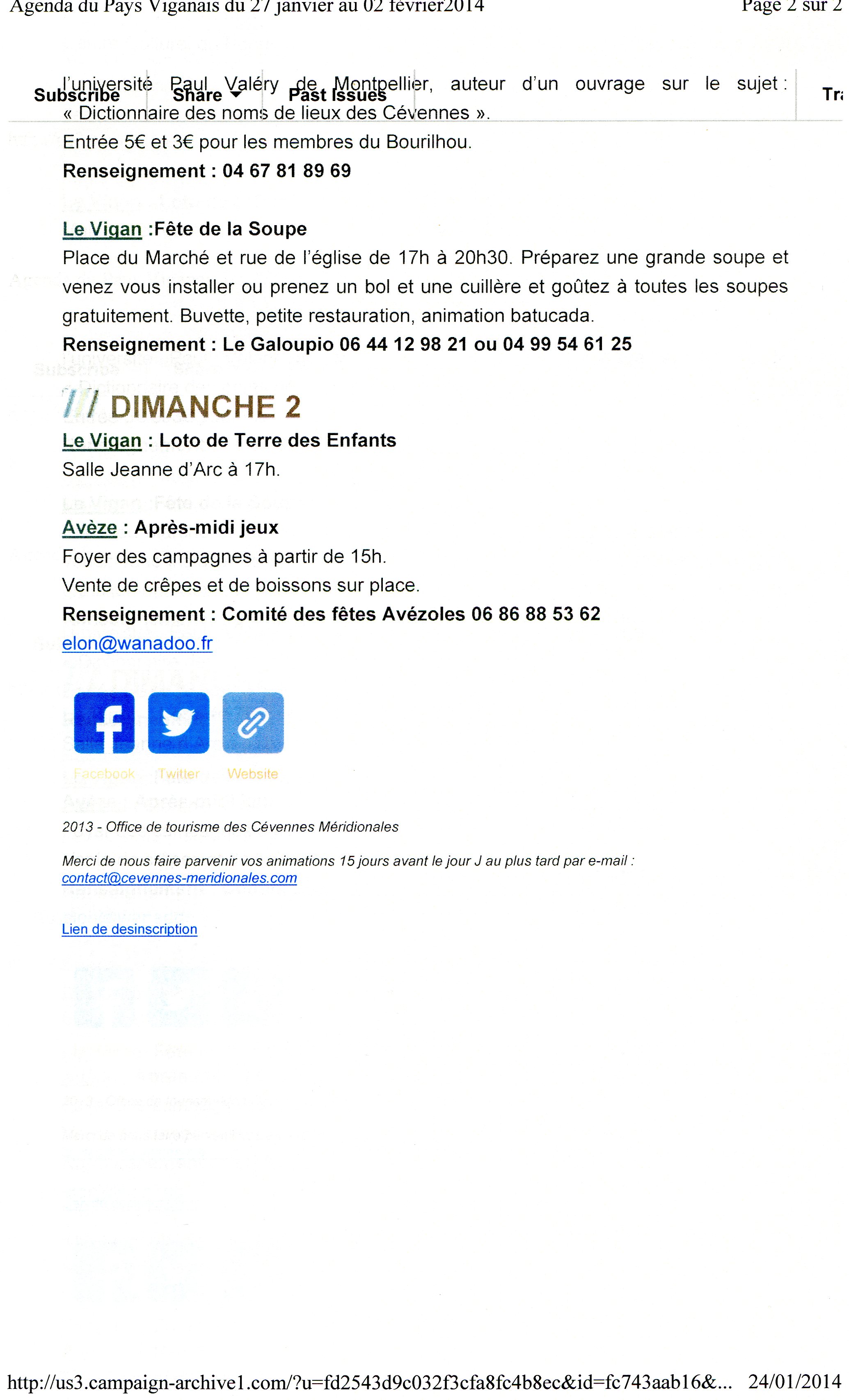 Comme chaque fin de semaine voici en pièce jointe l'agenda des animations pour la semaine du 27 janvier au 2 février 2014 sur tout le Pays Viganais. Bonne lecture !!!
