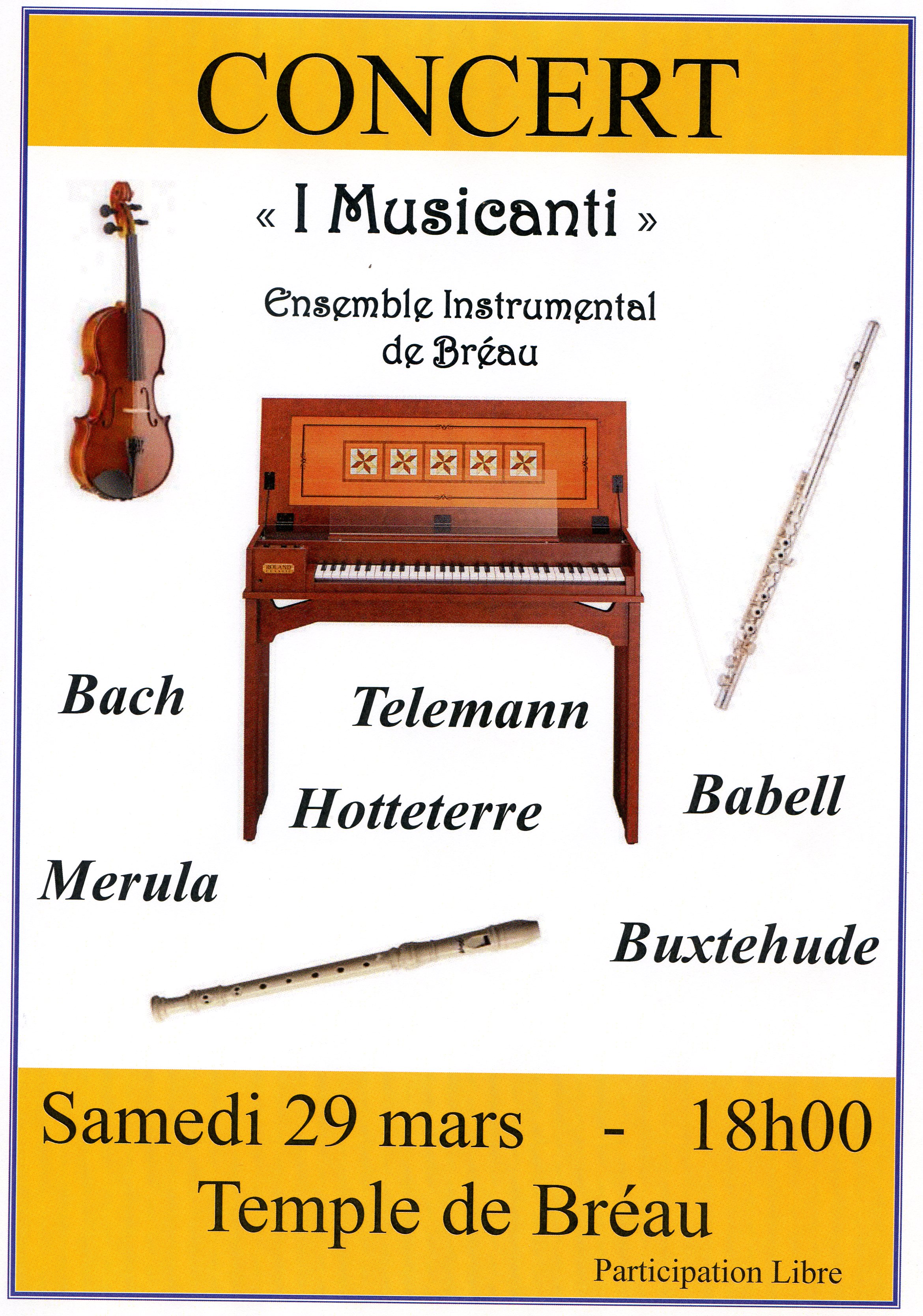 "I Musicanti" organise le Samedi 29 mars 2014 à 18 heures au Temple de Bréau un concert "Ensemble instrumental de Bréau" (Bach, Telemann, Hotteterre, Babell, Merula, Buxtehude).