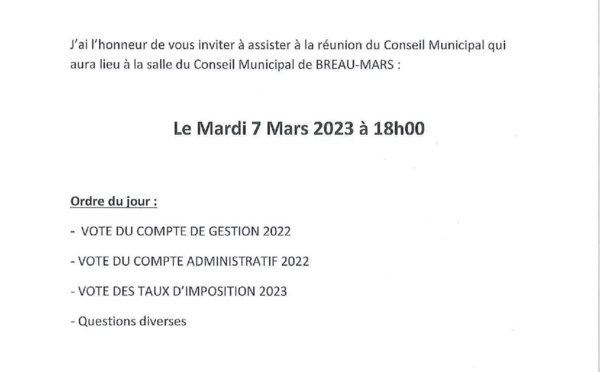 Le prochain conseil municipal aura lieu le 10/03/2020 à 18h à la Mairie de Bréau-Mars. Voici en PJ l'ordre du jour.