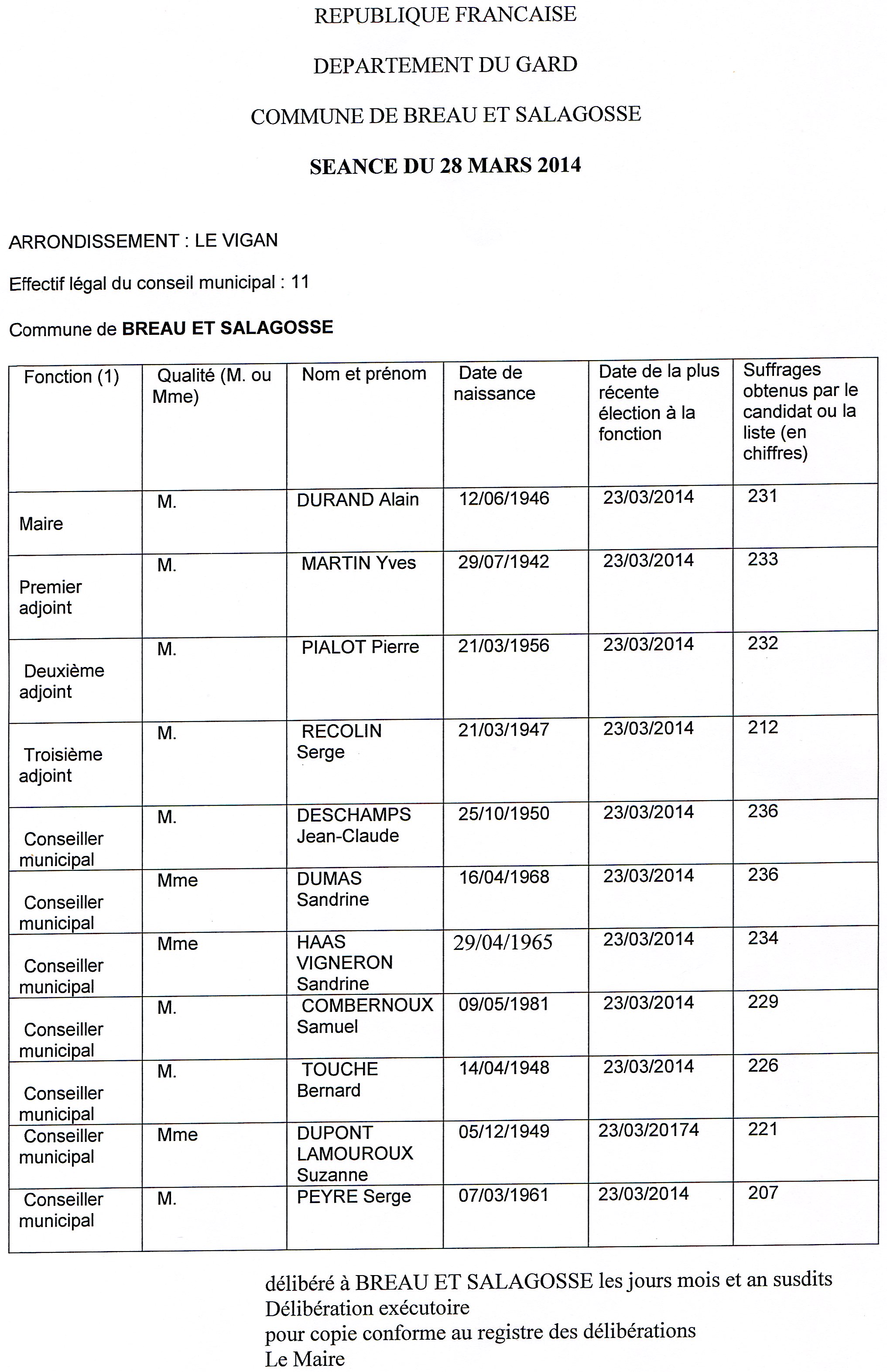 Dans sa séance du vendredi 28 mars 2014 à 18 heures, le conseil municipal a élu son Maire et ses 3 adjoints : Monsieur DURAND Alain Maire, Monsieur MARTIN Yves 1er adjoint, Monsieur PIALOT Pierre 2ème adjoint, Monsieur RECOLIN Serge 3ème adjoint.