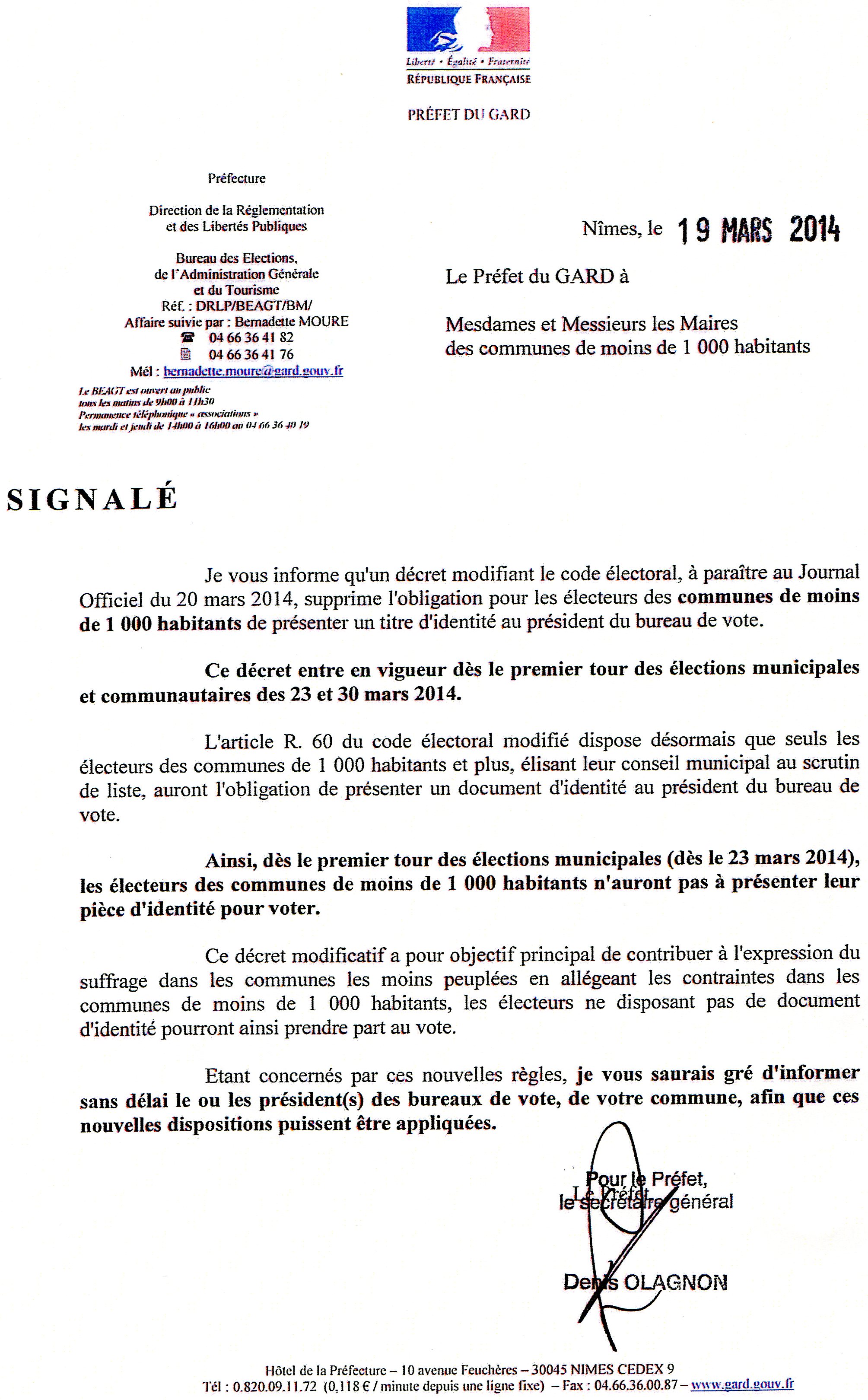 La Préfecture du Gard nous informe qu'un décret modifiant le code électoral, à paraître au journal officiel du 20 Mars 2014, supprime l'obligation pour les électeurs des communes de moins de 1000 habitants de présenter un titre d'identité au président du bureau de vote.