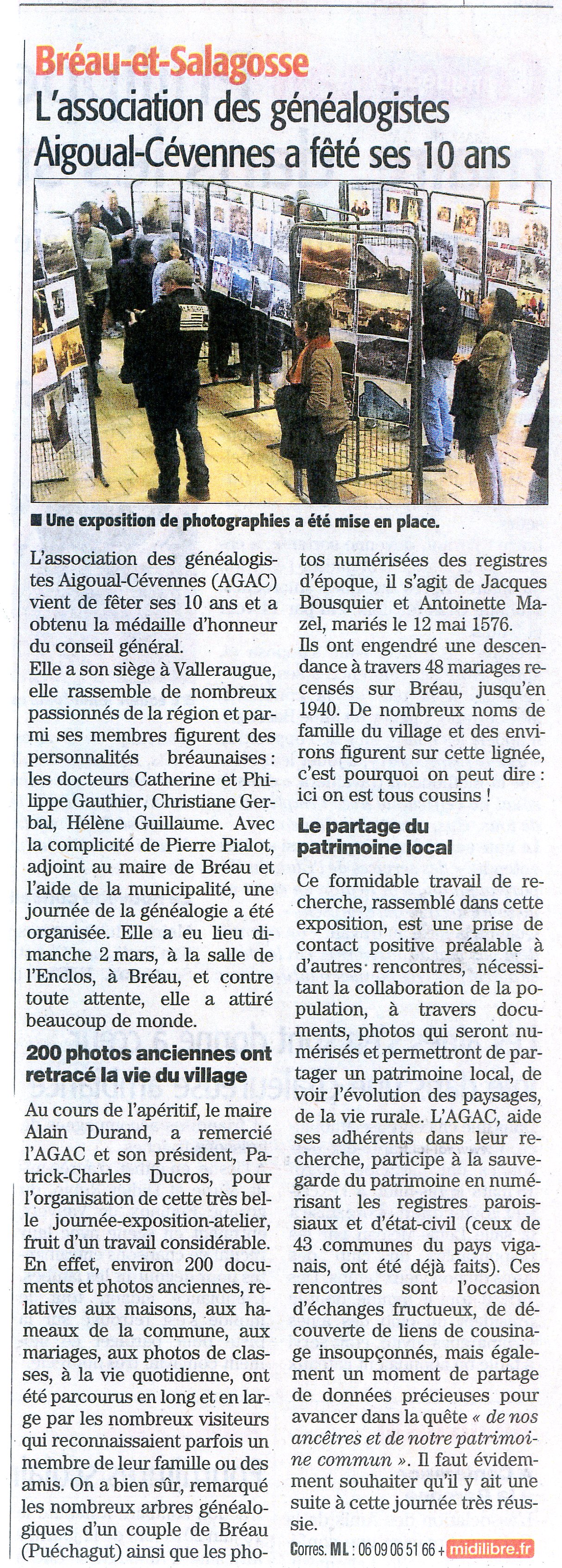 La journée de la généalogie qui a été organisée le Dimanche 2 Mars à la salle polyvalente de Bréau a connu un franc succès. Environ 200 documents et photos anciennes, relatives aux maisons, aux hameaux, aux mariage, aux photos de classe, à la vie quotidienne ont été exposés.