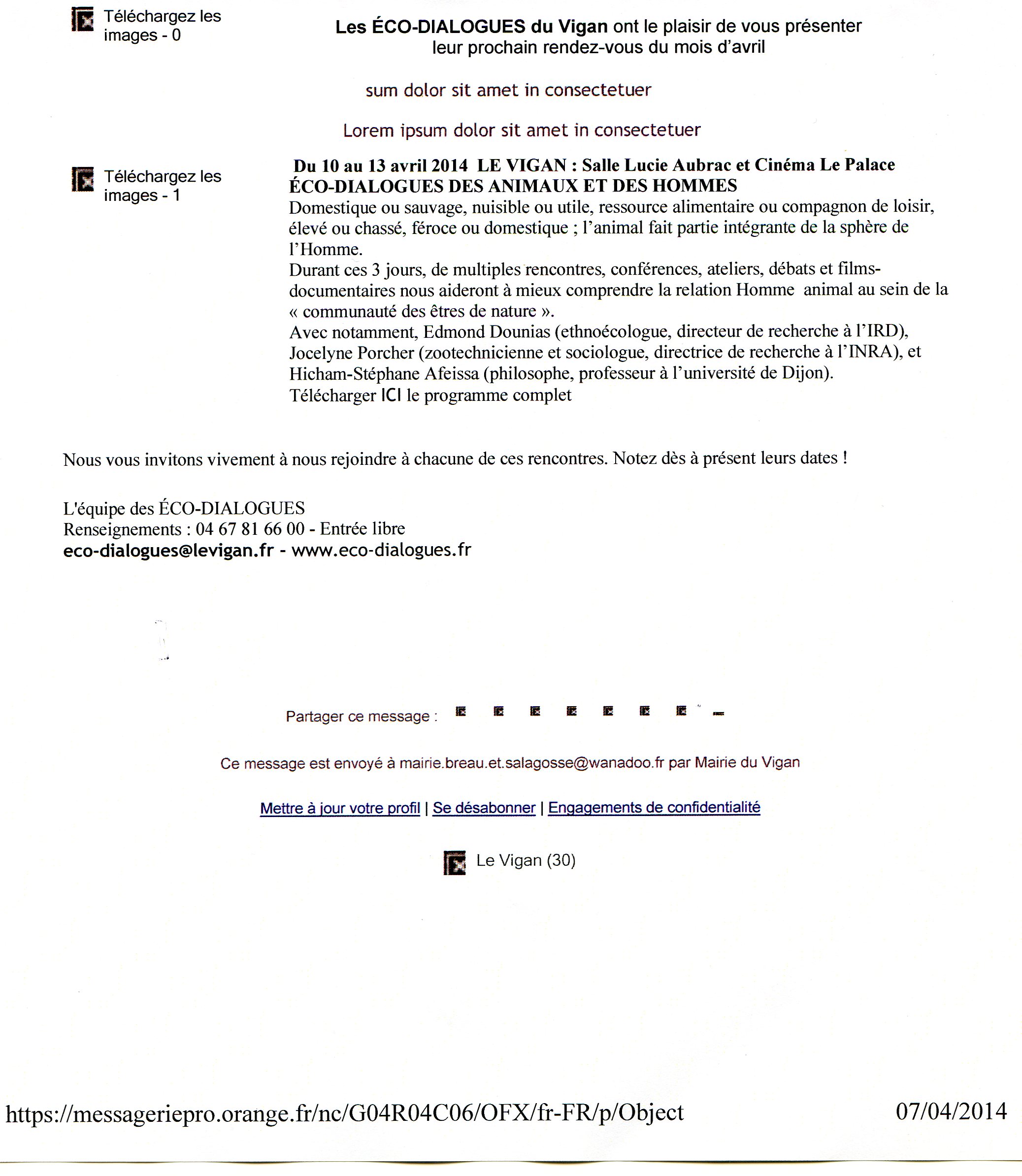 Du 10 au 13 avril 2014 à Le Vigan Salle Lucie Aubrac et Cinéma le Palace Eco-dialogues des animaux et des hommes.