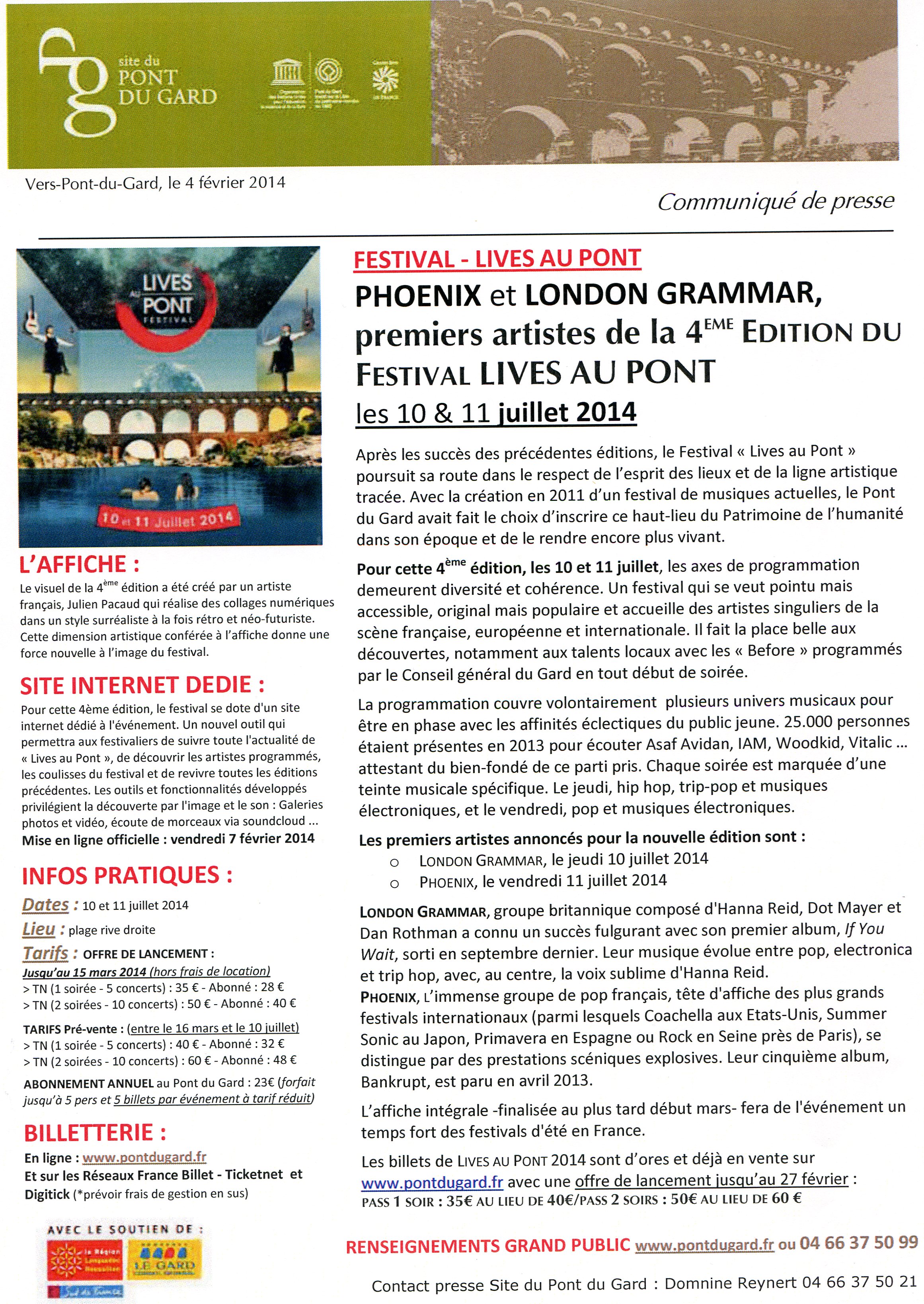 Du 10 au 11 Juillet 2014, les premiers artistes confirmés et annoncés de la 4ème édition du festival "Lives au Pont" sont Phoenix et London Grammar.