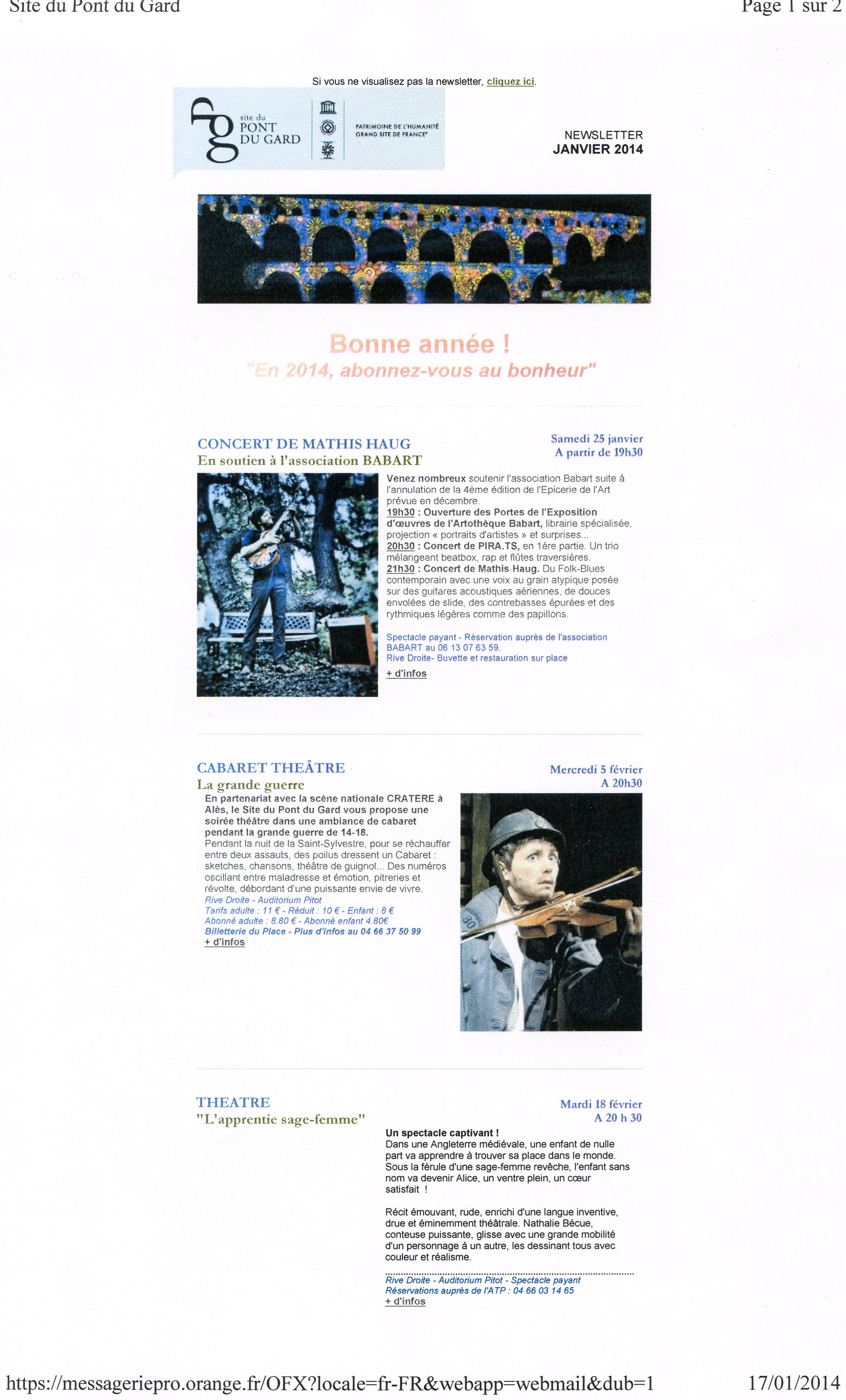 Veuillez trouver ci-joint la newsletter du POnt du Gard de janvier 2014. Bonne lecture !!