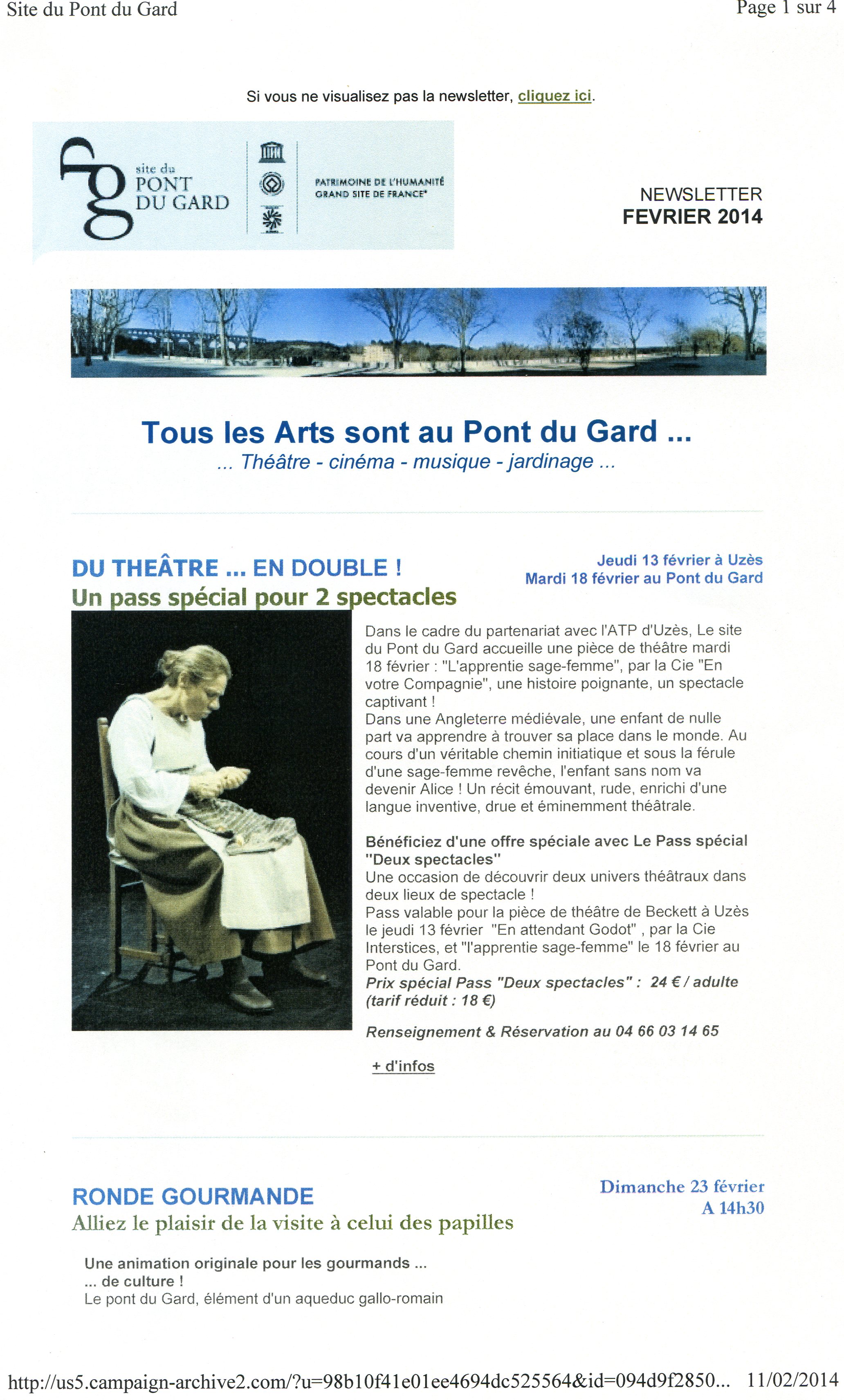 Ci-joint dates et animations correspondantes sur la newsletter du mois de Février 2014 du Pont du Gard. A vos lunettes !!!