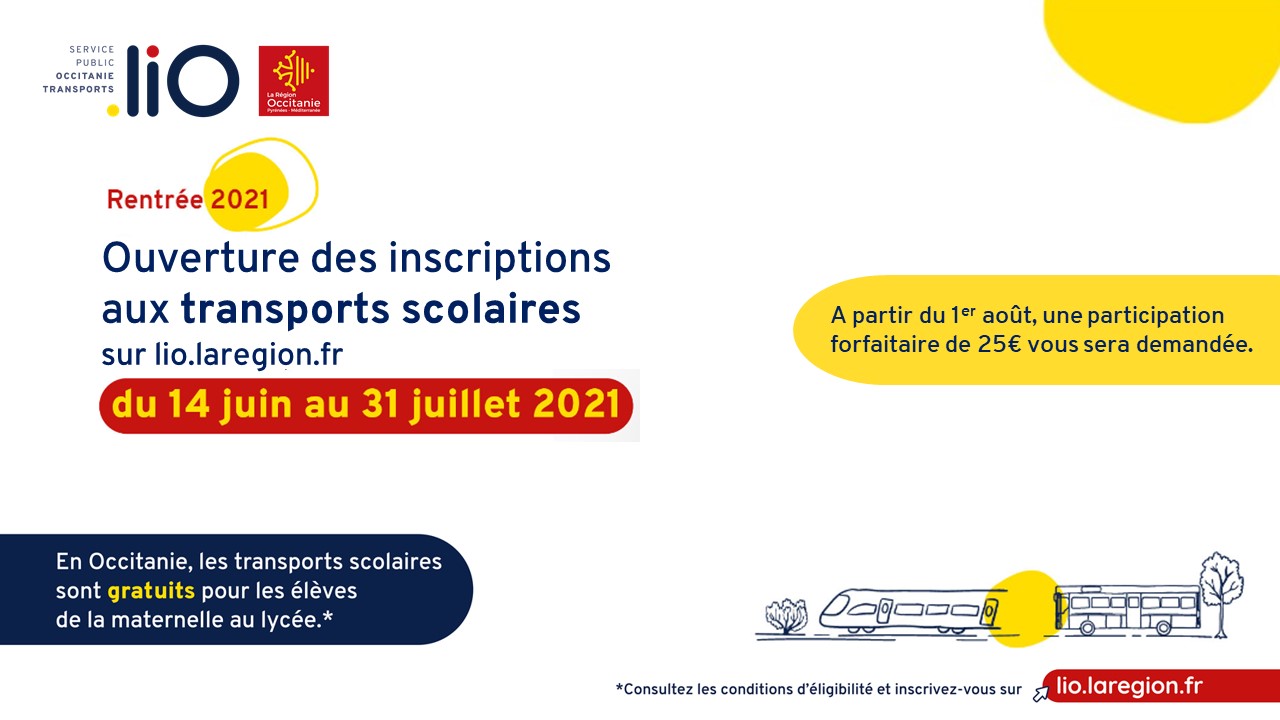 La gratuité ne dispense pas de l’inscription. A compter du 1er août, une participation forfaitaire exceptionnelle aux frais de transport scolaire pour inscription tardive de 25€ sera demandée aux familles. Cette année encore, compte tenu de la situation sanitaire, l’inscription en ligne est privilégiée sur www.lio.laregion.fr.
