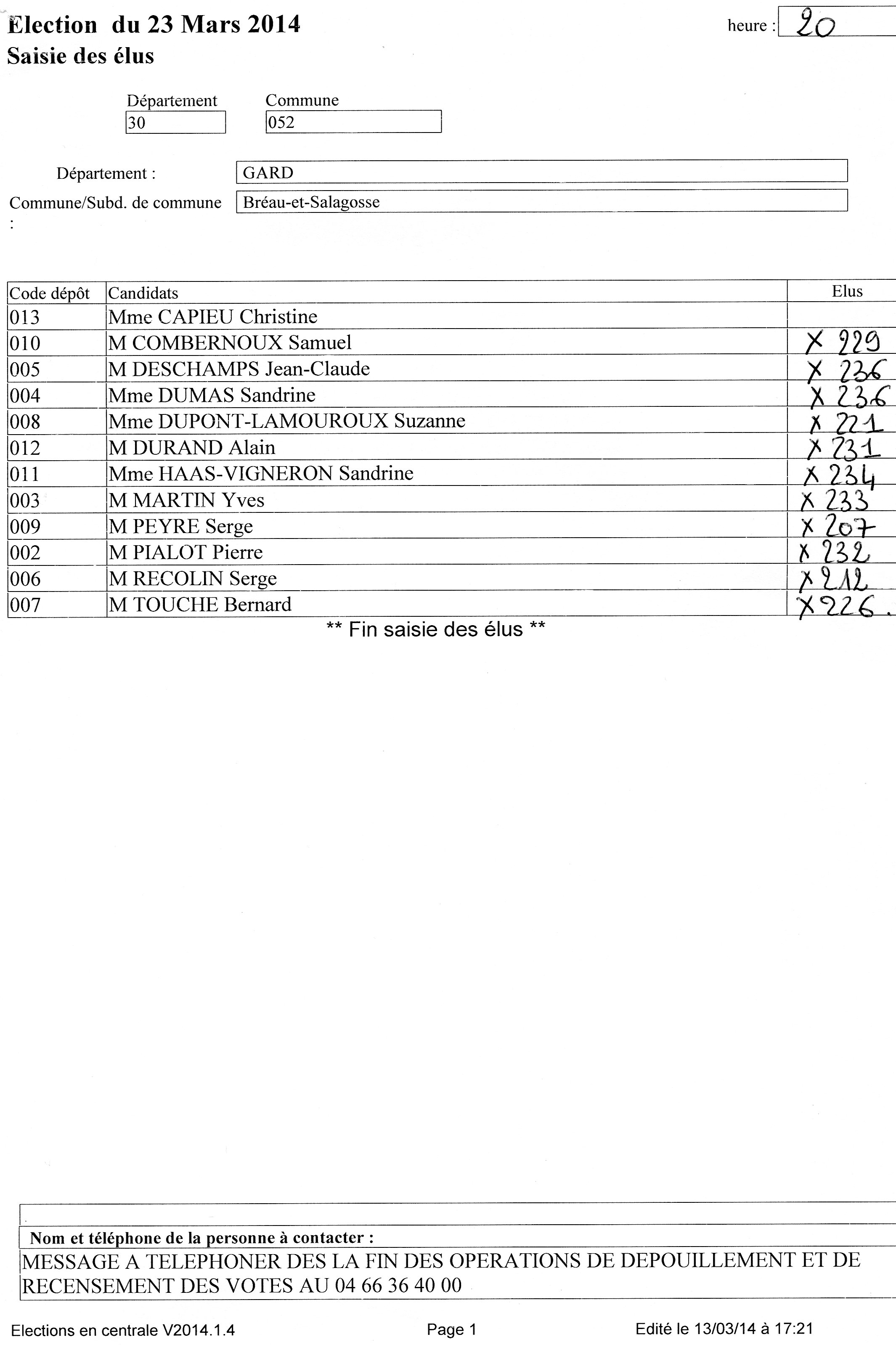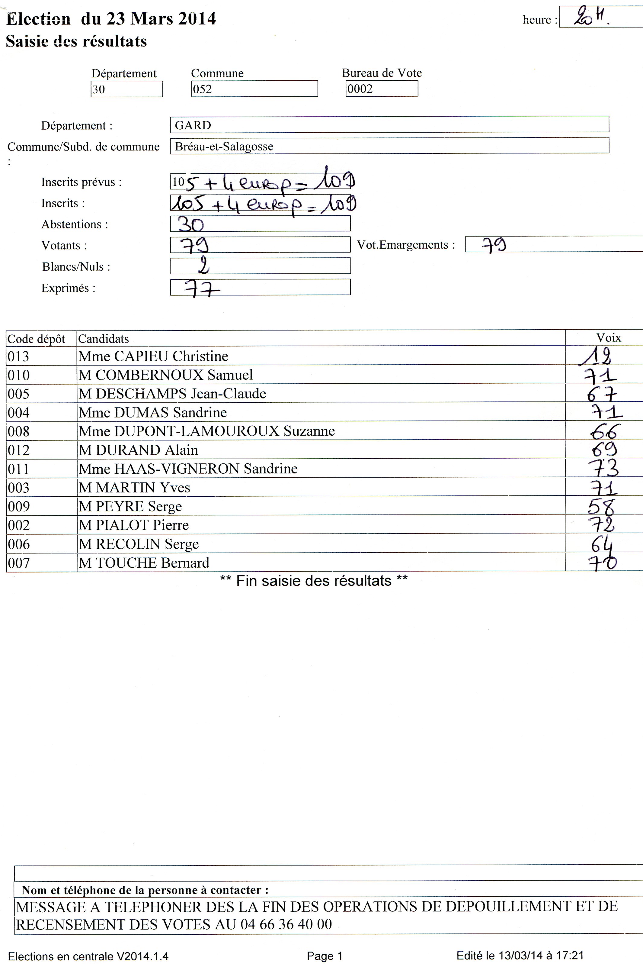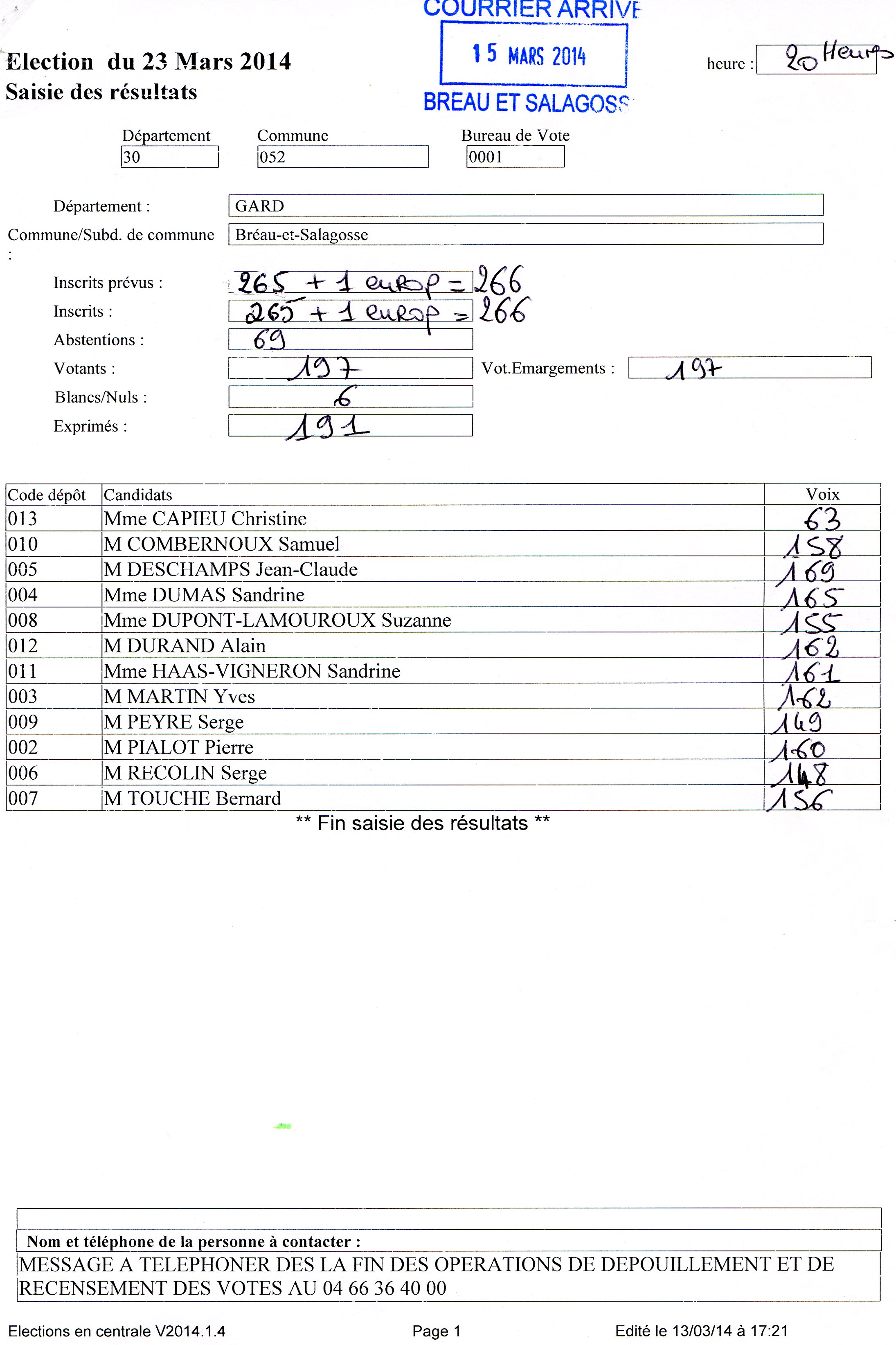 En pièce jointe vous trouverez les résultats par bureau des candidats se présentant lors du 1er tour des élections municipales du 23/03/2014.